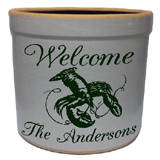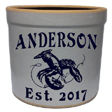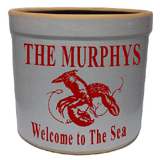 The lobster personalized crock is deeply etched and then hand painted. It is available in burgundy, navy, green, red and black.